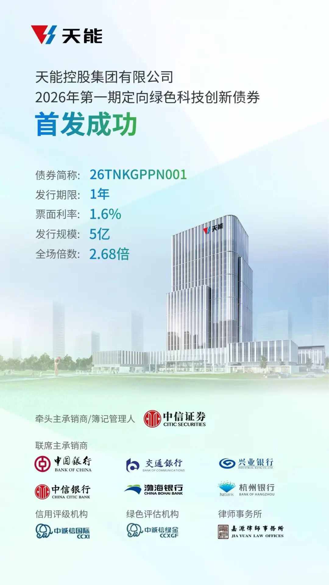 本期债券发行规模为5亿元,期限为1年。凭借天能稳健的经营实力、良好的信用水平及广阔的发展前景,中国银行(HK3988)、交通银行(HK3328)、兴业银行(601166)等多家金融机构踊跃参与认购,全场认购倍数达2.68倍。本次发行利率为1.6%,创下全国PPN(定向债务融资工具)历史最低水平,充分反映了资本市场对天能科技创新和绿色产业的“双重认可”。