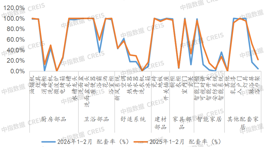 2026年1-2月,空调(884113)、智能系统、灯具、乳胶漆等配套率小幅提升4-8个百分点;部分部品配套率大幅下降,包括浴霸、玄关、可视对讲、淋浴屏等降幅超过20个百分点。