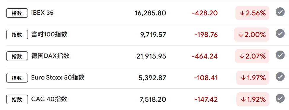 3月23日,欧洲股市跌幅扩大,跌幅基本在2%左右。
