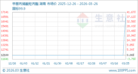 3月26日,生意社甲基丙烯酸(885829)羟丙酯基准价为16683.33元/吨,与本月初(12100.00元/吨)相比,上涨了37.88%。