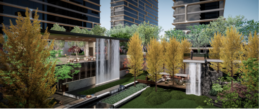 规划打造约2.27万㎡双庭院立体园林,其中,约2000㎡立体山林庭院复刻《千里江山图》意境,层峦叠翠,人行其中如在画中游;约350㎡琉璃水院采用潘多拉透光奢石镶嵌,光影入水,静谧而璀璨。
