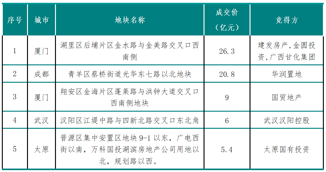 ▍宅地总价TOP5:厦门宅地地块成交价居首位,TOP5中无一线城市地块