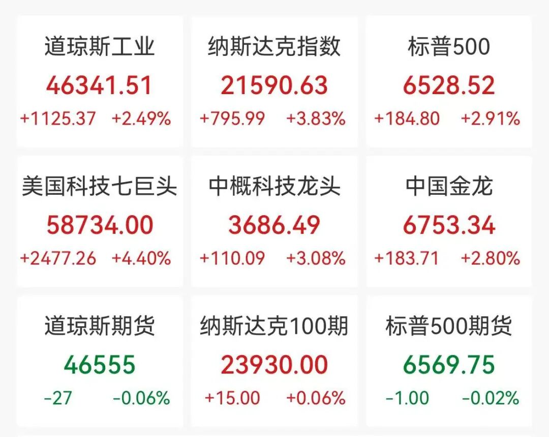 美股科技七巨头集体大涨,Meta(META)涨6.67%,英伟达(NVDA)、谷歌涨超5%,特斯拉(TSLA)涨4.6%。