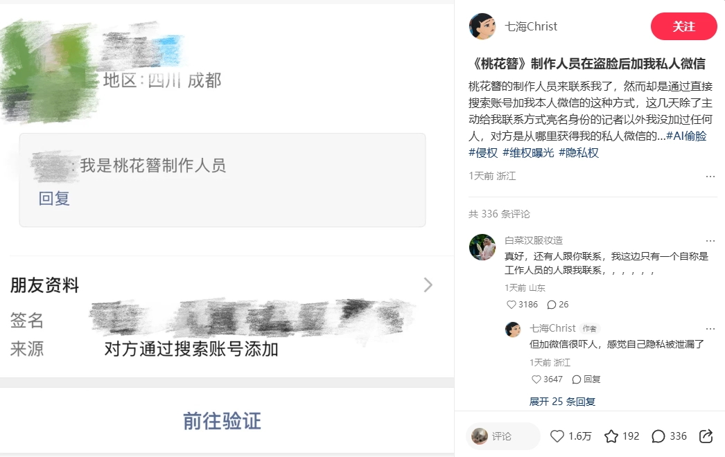 同日,另一名博主“七海 Christ”也发布视频称,自己在同一部剧中发现了疑似盗用其面部形象的角色“何掌柜”,该角色被设定为虐待动物、扇打女性等负面形象。后续《桃花簪》制作人员添加其微信,她因此而感到惊恐。