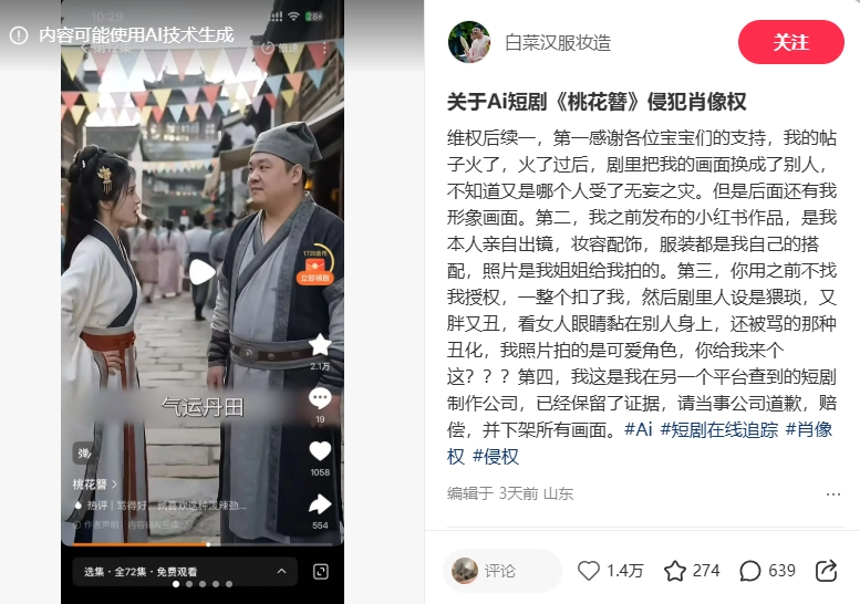 IT之家查询获悉,该事件起因于 3 月 30 日,博主“白菜汉服妆造”(以下简称“白菜”)在社交平台发文称,自己在红果短剧平台播出的《桃花簪》中,发现剧中一名贪财好色的反派角色“刘大”,其服装、配饰、妆容乃至五官长相均与自己此前拍摄的一组汉服写真高度一致。