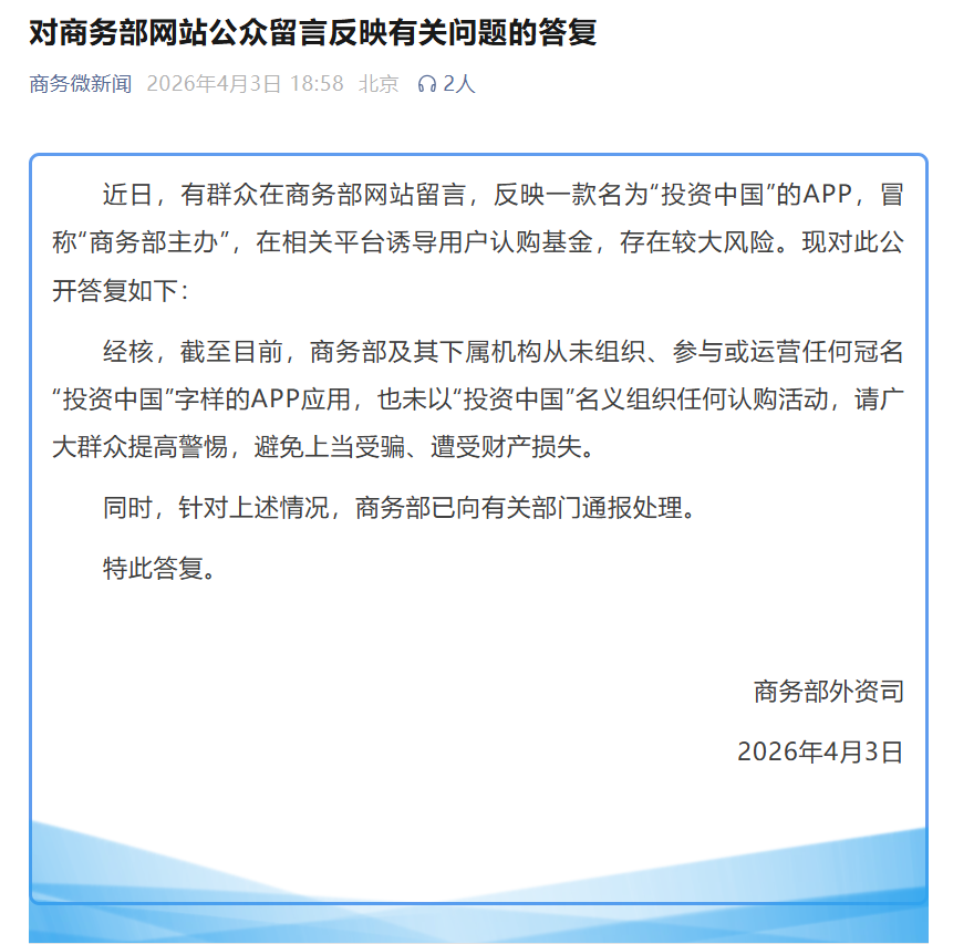 上证报中国证券网讯 据商务微新闻4月3日消息,近日,有群众在商务部网站留言,反映一款名为“投资中国”的APP,冒称“商务部主办”,在相关平台诱导用户认购基金,存在较大风险。现对此公开答复如下: