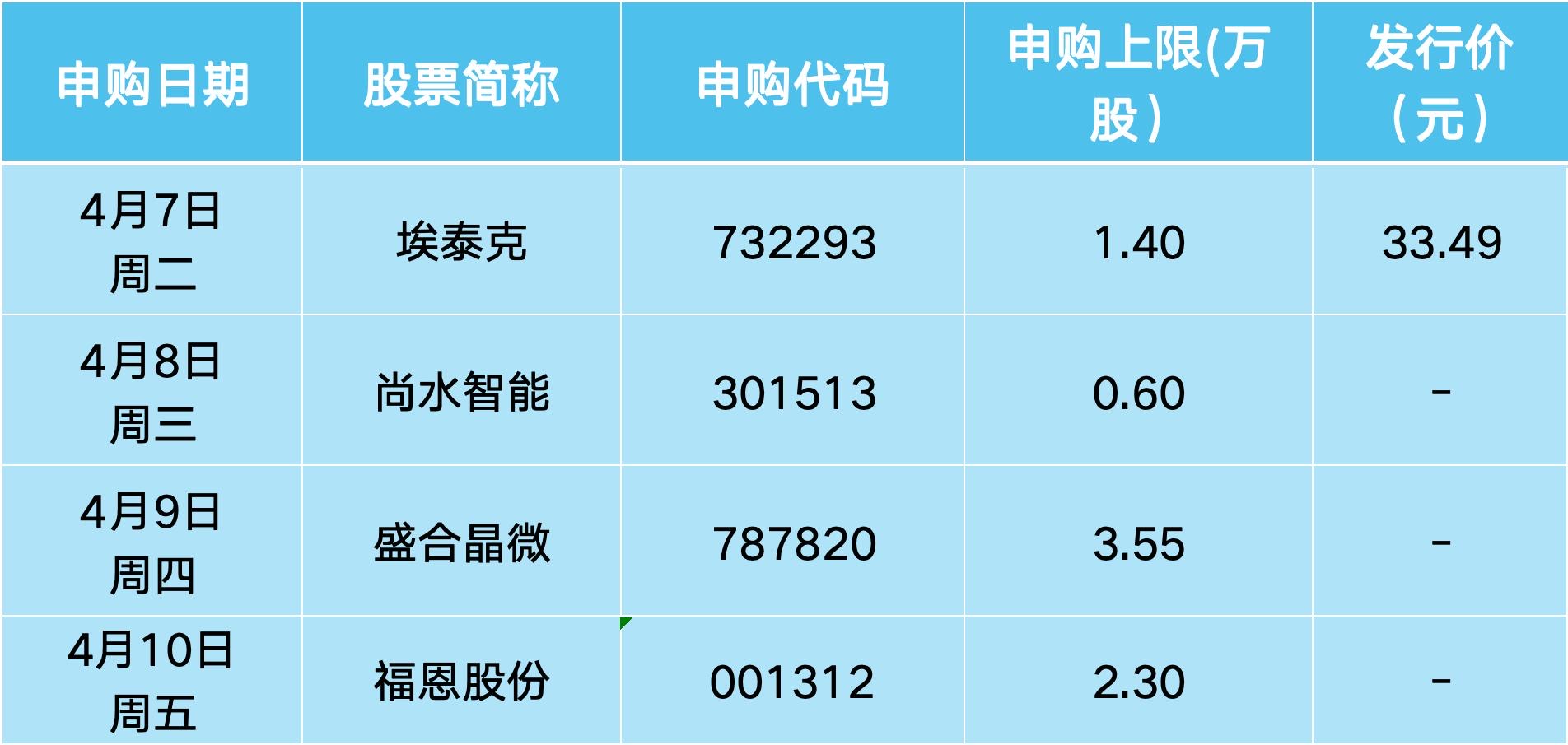 本周沪深两市共有4只新股申购,上市地点分别为上交所(埃泰克(603293))、深交所(尚水智能(301513)、福恩股份(001312))、科创板(盛合晶微(688820))。