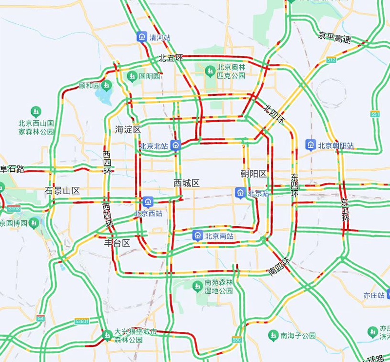 城区东部、西部、北部区域主要环路部分路段,京藏、京承、京开、京港澳、京通快速路进京方向,莲石东路、菜户营南路、阜石路等联络线进城方向部分路段易出现车辆行驶缓慢情况。德胜门、西便门、劲松等区域交通压力较大。