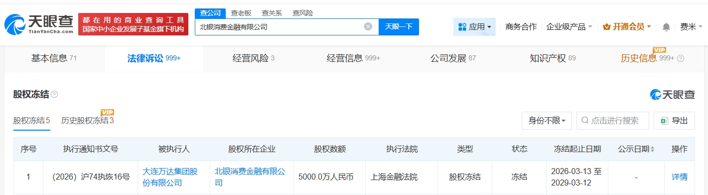 每经AI快讯,天眼查App显示,北银消费(883434)金融有限公司新增一则股权冻结信息,被执行人为大连万达集团股份有限公司,冻结股权数额5000万元,冻结期限为3年,执行法院为上海金融法院。该公司成立于2010年2月,法定代表人为么毅,注册资本10亿元人民币,经营范围为消费(883434)金融服务,由北京银行(601169)(601169)、桑坦德消费(883434)金融有限公司、利时集团股份有限公司等共同持股,其中大连万达集团股份有限公司的持股比例为5%。