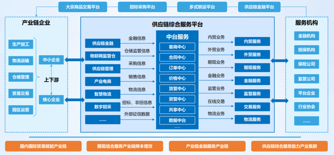 要以供应链综合服务商为核心定位,串联产业链上下游、内外贸、政银企等多方主体,构建协同高效、开放共享、安全可控的产业集群生态体系,以平台化生态重塑区域产业核心竞争力,实现产业链、供应链、价值链、资金链、数据链全面优化,契合“十五五”时期产业集群生态系统竞争的核心要求。