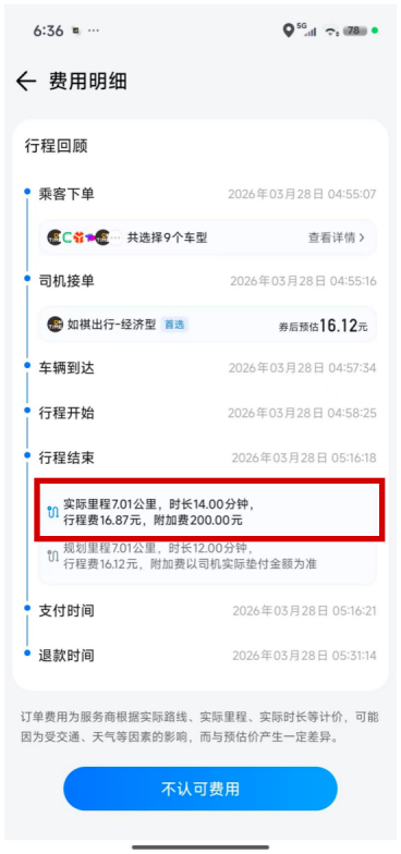 广东的消费(883434)者王先生(化名)则在如祺出行(HK9680)用车后被要求支付高达200元的附加费。记者从王先生提供的订单截图可以看到,其乘坐如祺出行(HK9680)经济型车辆,实际里程7.01公里,时长14分钟,行程费16.87元,附加费却高达200元。