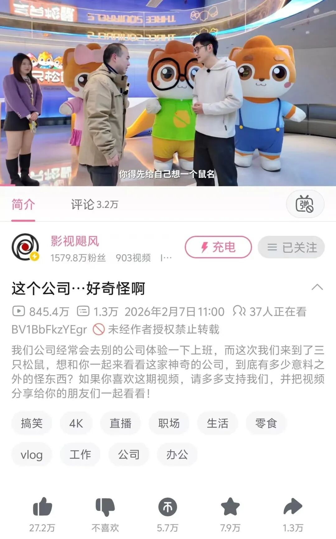 此前,三只松鼠(300783)“员工均以鼠XX命名”的话题曾引发网友特别是年轻圈层的热议,其鲜活有趣、自带温度的企业文化,天生就具备强话题属性。此次合作的核心内容作品《这个公司...好奇怪啊》应运而生,这支沉浸式企业体验类Vlog,融合了纪实探店、职场体验、趣味猎奇三大形式,以“找怪东西”为核心视角,打破了大众对零食企业和职场办公的固有印象。