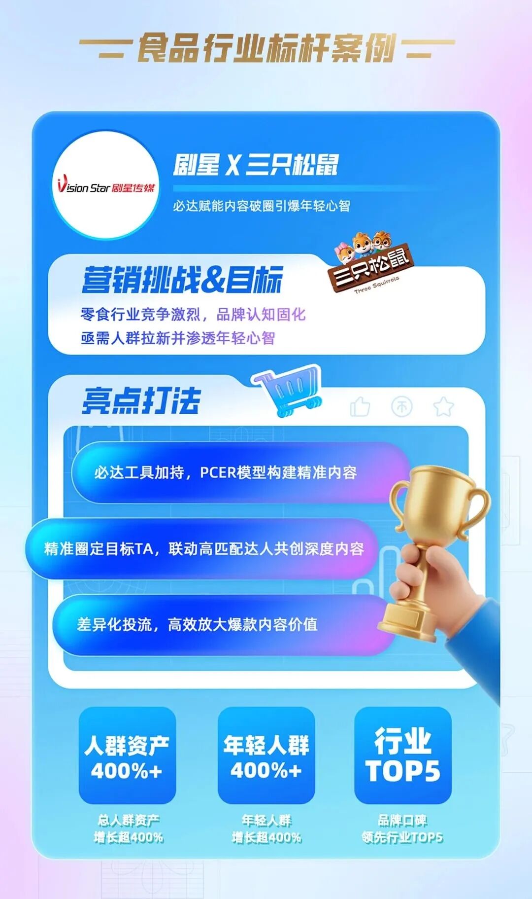近日,在B站「新创力(LTRX) · 新创益」宠婴食行业标杆案例大赏中,剧星传媒携手国民零食品牌三只松鼠(300783)打造的营销案例,凭借对年轻用户的精准洞察与创新的内容打法,成功斩获食品行业标杆案例,用实力破解品牌“年轻心智渗透”这一行业共性难题。