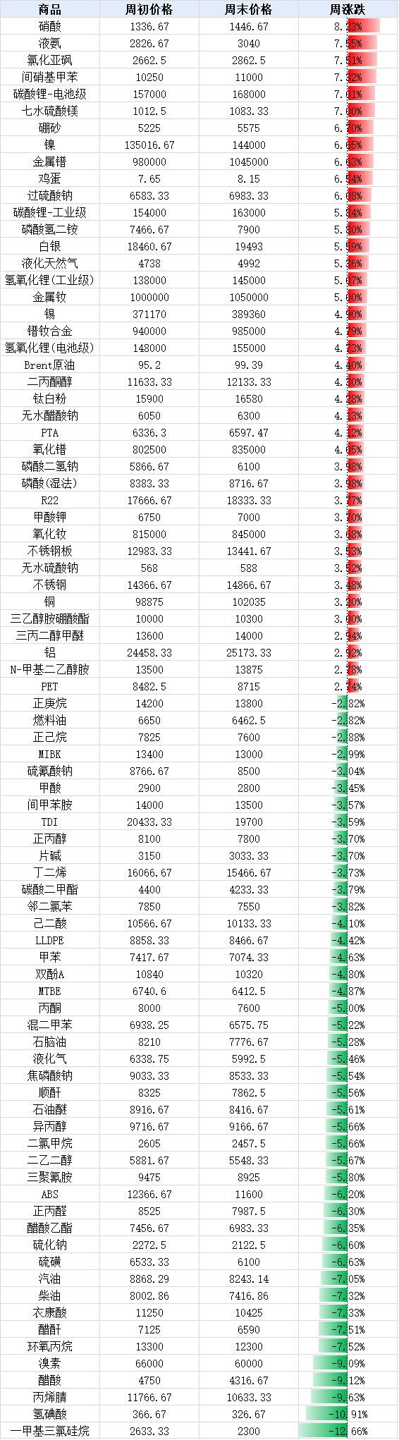 据生意社价格监测,2026年第15周(4.13-4.17)大宗商品价格涨跌榜中环比上升的商品共108种,集中在化工(850102)板块(共63种)和有色板块(共17种),涨幅在5%以上的商品主要集中在化工(850102)板块;涨幅前3的商品分别为硝酸(8.23%)、液氨(7.55%)、氯化亚砜(7.51%)。