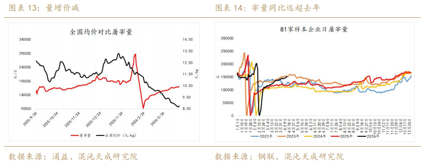 首先从总量矛盾上观测,生猪需求的刚性特质导致研究需求的弹性影响因子较为困难。如果我们直观的观测宰量,2026年的宰量同比高企却不能说明需求端有同比走强的迹象,这是由于屠宰因子具备供需双特质造成的。更好验证需求的路径或是需要进行供需平衡后的价格分析,即当宰量增长价格上升时,需求增长的可能性大;反之宰量增而价格落时,供增远大于需增的可能性大,而屠宰量级在以上两种情况下均以绝对量增加来表达。
