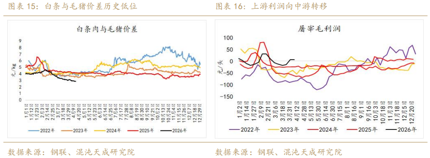 除了直接观测宰量,同样可以从白条与毛猪价差这一指标来验证需求。通常好需求支撑下白条肉价涨幅大于毛猪,从而可以见到白条与毛猪价差的走扩。然而这一验证指标的另一面也有供给的影子,过剩的毛猪基数导致屠企议价权显著增强,可以见到上游亏损加深的过程中屠宰利润反而同比走强,上游利润向中游转移。总的来讲,当前白条与毛猪价差处于历史低位,可能是强供给与弱需求共同作用的结果。