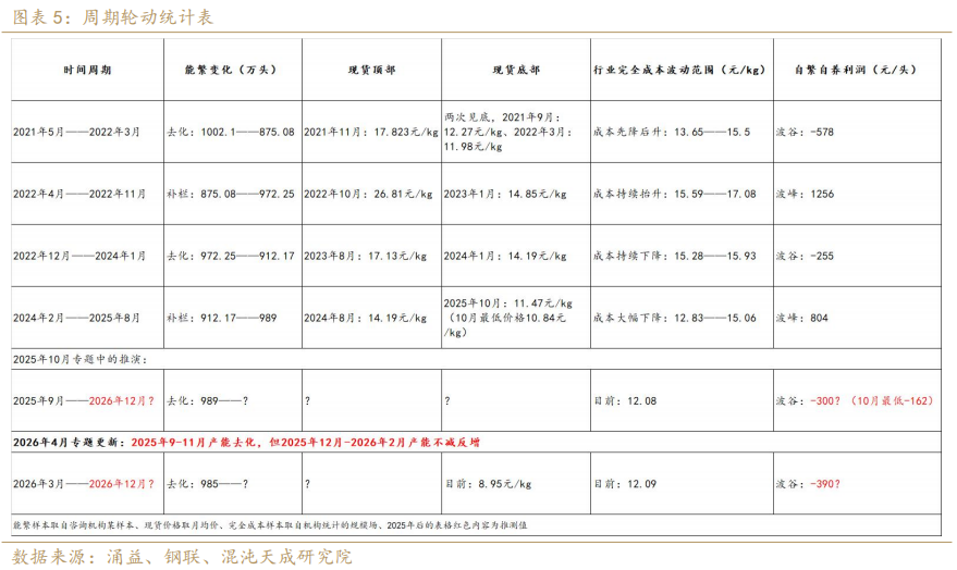 周期角度,上一轮丰厚盈利使得行业积累充裕现金流,规模化加剧使得产业调节产能的灵活度大增,机构样本显示25年四季度到26年一季度能繁存栏量先降后增,产能去化进程延缓,存量矛盾持续累积,从而造成今年的淡季深亏。