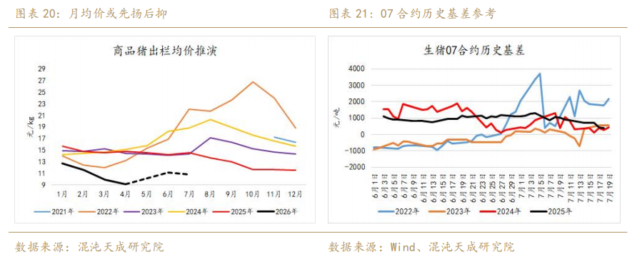 我们延续上文对现货的推演,3月开始供应量环比下滑但同比仍然过剩,这一趋势在6月出现季节性转折,估值分歧在于去库速率。那么我们假设中性情况下两个条件成立:1.中性的降重速率,未来3个月均重下降幅度不超过2kg。2.现货底部在未来2个月逐步抬升中枢,6月份阶段性供需差低点之时现货达到11元/kg的均值。再结合7月平均基差700元/吨来看,最终07合约盘面的理论估值可能抵达10300元/吨(11元/kg*1000-700元/吨)。按照中性情况估值推演,盘面仍然存在高估情况。虽然基本面角度供需压力最极端的节点可能已现,但边际好转幅度仍然难以有较大期待,升水压力仍然是后续合约的主要利空因素。而抄底角度需要苛刻的左侧条件,07/09合约需要重点关注去库速率,即均重降速与存栏同比下滑水平;远月合约需要重点关注能繁去化斜率,一季度农业部官方显示能繁存栏降至3904万头,已达官方正常保有量,但这以数据与机构样本劈叉的较多,我们认为需要客观看待能繁基数的下降与当下产效的提升,后续重点关注边际变化而非纠结绝对量级。