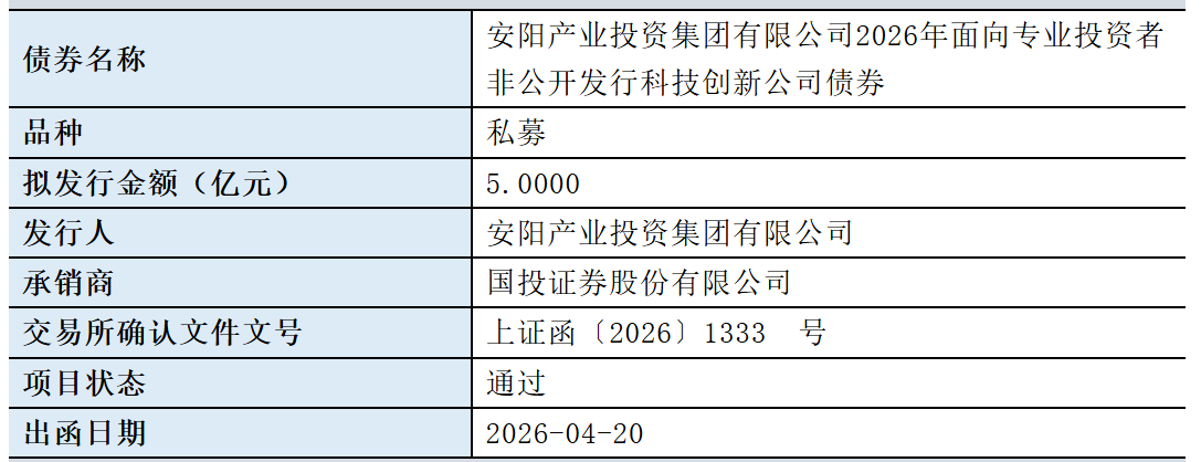 【大河财立方消息】4月21日,安阳产业投资集团有限公司2026年面向专业投资者非公开发行科技创新公司债券项目,获上交所通过。