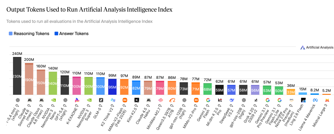 在 Artificial Analysis Intelligence Index 的完整评测中,Ling-2.6-flash 展现出显著更优的 Token 效率:其总消耗仅为 15M tokens,而 Nemotron-3-Super 等模型达到或超过 110M tokens。换言之,Ling-2.6-flash 仅用约 1/10 的 token 消耗完成同类评测任务,体现出更精简的输出方式与更高的智效比。