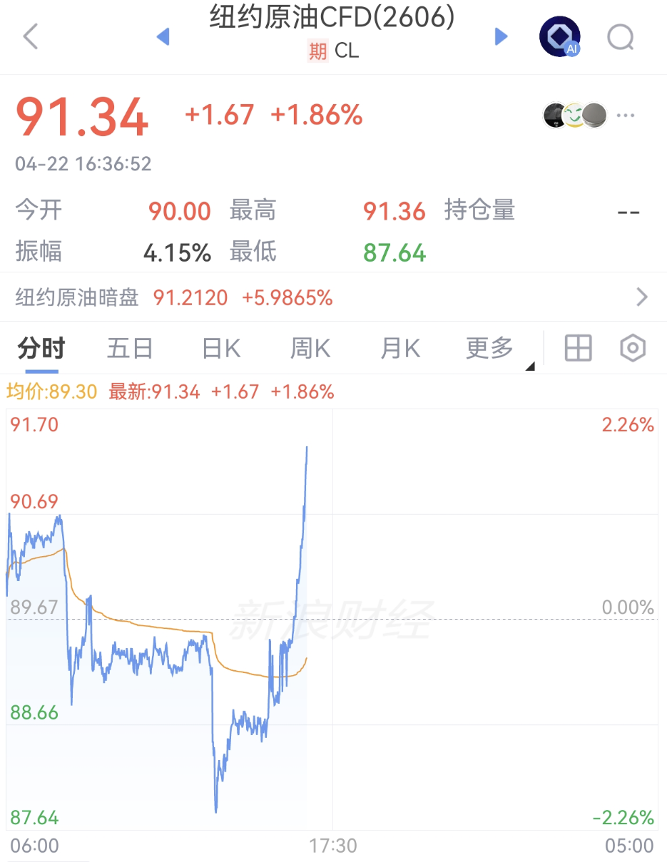 美油站上91美元/桶,截至发稿,涨幅达1.86%。
