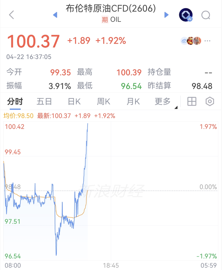 4月22日下午,国际油价短线跳水后迅速修复,随后直线走强。布油突破100美元/桶,日内涨幅近2%。