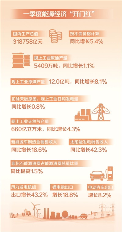 转型更绿色——为全球贡献80%以上的光伏组件和70%的风电(885641)装备,中国已建成具备国际竞争优势的新能源(850101)全产业链体系。助力全球清洁低碳转型的同时,中国新能源(850101)产业成为国内经济新增长极。一季度,非化石能源(850101)消费(883434)占能源(850101)消费(883434)总量比重同比提升1.5%。仅2月,全国新增建卡立档的新能源发电(884150)项目就达4054个。能源(850101)绿色转型成为经济新引擎,展现出对经济发展的强大拉动力,从增值税发票数据可见一斑:一季度,节能、环保等绿色技术推广服务同比分别增长28.7%和17.8%,太阳能发电销售收入同比增长42.3%,新能源(850101)车制造业销售收入同比增长18.6%……绿色能源(850101)产业向上向好,带动产业链相关企业持续健康发展,催生对高素质人才需求,为稳就业促发展提供支撑。
