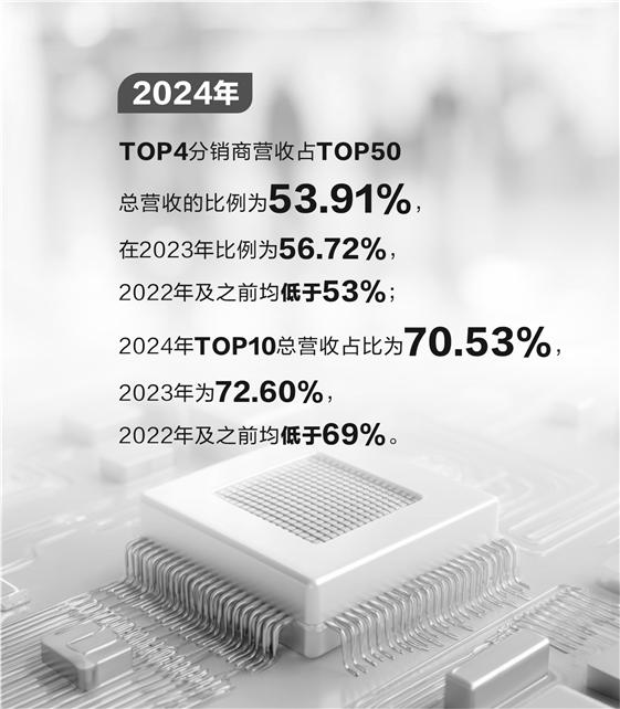 同时,产业集中度稳中有升。据《国际电子商情》统计,2024年TOP4分销商营收占TOP50总营收的比例为53.91%,在2023年比例为56.72%,2022年及之前均低于53%;2024年TOP10总营收占比为70.53%,2023年为72.60%,2022年及之前均低于69%。