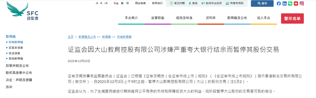 12月3日,香港证券及期货事务监察委员会(以下简称“香港证监会”)已根据相关规则指示香港联合交易所有限公司(联交所),自2025年12月3日上午9时正起,暂停大山教育(09986.HK)的股份交易。