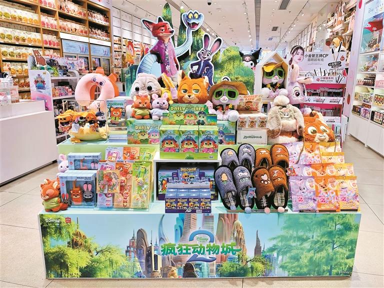 潮玩周边是迪士尼的传统强项。这次《疯狂动物城2》联名了名创优品、52TOYS等一批头部潮玩品牌。记者12月4日来到位于深业上城一楼的名创优品门店,看到《疯狂动物城2》联名的玩具、手表、挂件等产品位于正门口最显眼的位置。据店员介绍,近日卖得最火爆的是一款售价78元的盲盒。52TOYS公司这次则霸榜天猫和抖音商城TOP1的《疯狂动物城》系列,“狐兔cp”的盲盒、棉花糖娃、手机绳等都精准接住了观众对IP的情感需求,把电影里的名场面,变成摸得着、能收藏的东西。