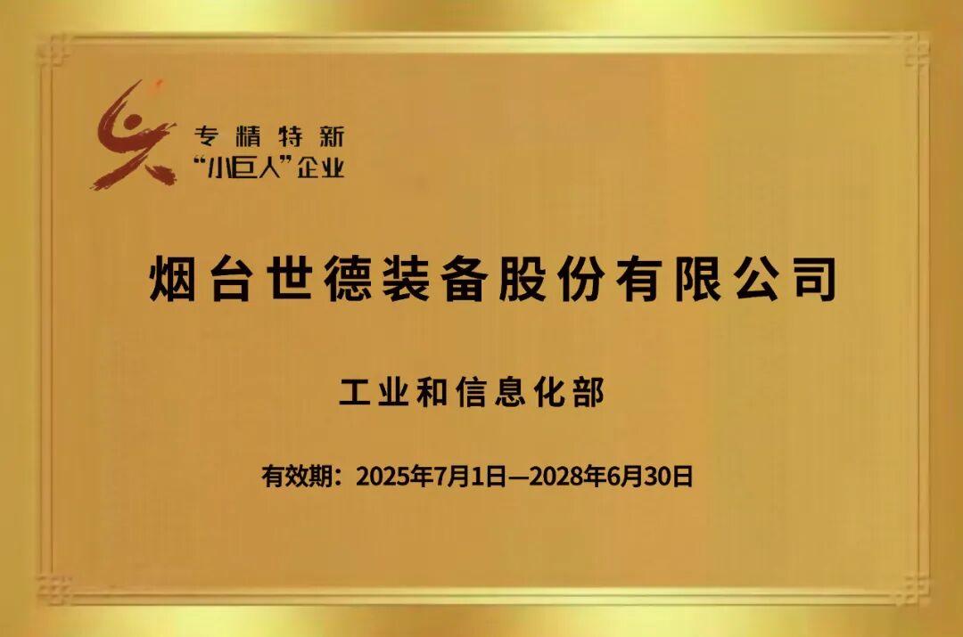 近日,工业和信息化部正式公布2025年专精特新“小巨人”企业复核结果,烟台世德装备股份有限公司,凭借在高端装备制造领域深耕几十年和细分市场的核心竞争力,继2022年首次获评后,继续被授予国家级专精特新“小巨人”企业称号,再次印证了公司“专业化、精细化、特色化、创新型”发展的能力和水平。