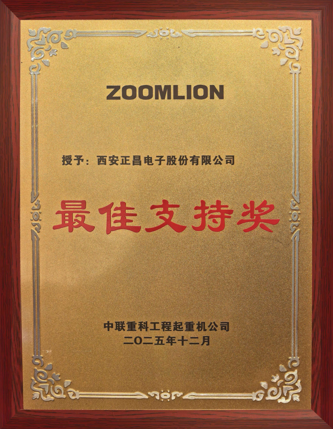 正昌电子荣获中联重科起重机公司2025年度“最佳支持奖”