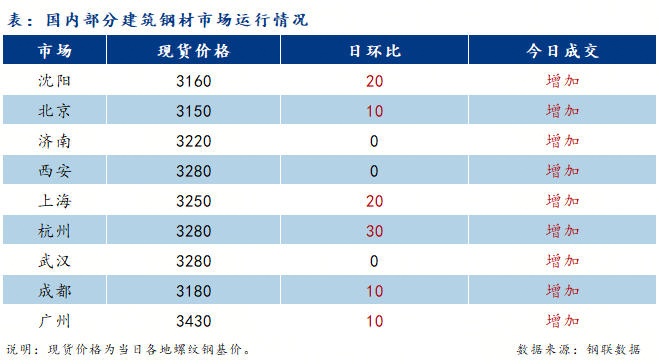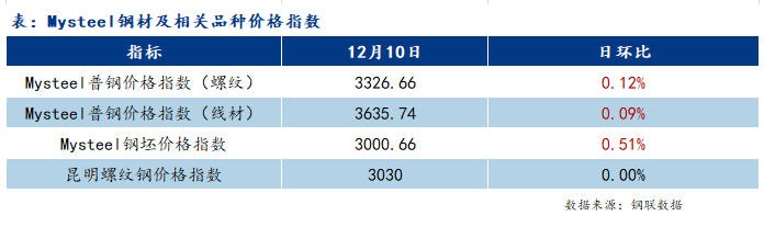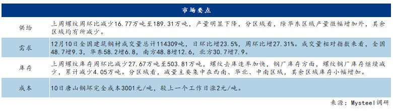 今日国内城市建筑钢材价格止跌回升,现货普遍上涨10-20元/吨左右,成交有所放量。具体来看,早盘市场整体偏弱,多数城市现货价格小幅下跌,午后在消息面影响下,期货价格率先拉涨,现货市场小幅跟涨,前几日挤压情绪爆发,成交回升。总体来看,市场可能仍有一定上探空间。12月10日全国建筑钢材成交量总计114309吨,日环比增23.5%,周环比增27.31%。