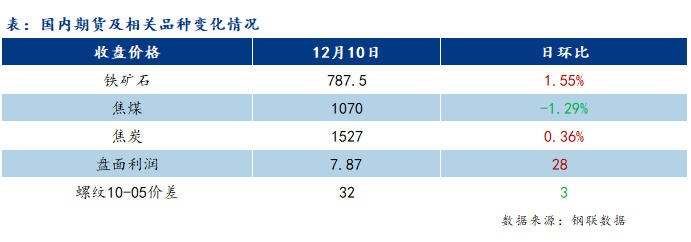 3、截至12月10日收盘,螺纹钢2605收3117元/吨,涨0.97%;热卷2605收3282元/吨,涨0.58%;铁矿石2605收769.0元/吨,涨1.85%。