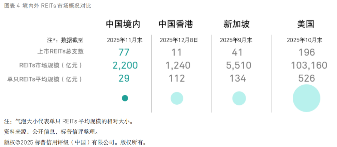 中国境内REITs 市场现状:单数多规模小,聚焦基础设施。我国基础设施REITs自2020年开启试点以来,经历了从破冰起航、市场震荡到常态化发行,基础制度和产品框架历经了5年的逐步优化与完善,且已经上市的消费基础设施REITs表现稳健,为此次商业不动产REITs的全面开闸奠定了良好的基础。截至2025年11月末,已上市的基础设施REITs合计77只,总市值约2,200亿元。虽然我国基础设施REITs在项目单数上已经跃居全球第二(仅次于美国),但在产品规模和业态类型上,相较于境外市场,尚有较大的发展空间。