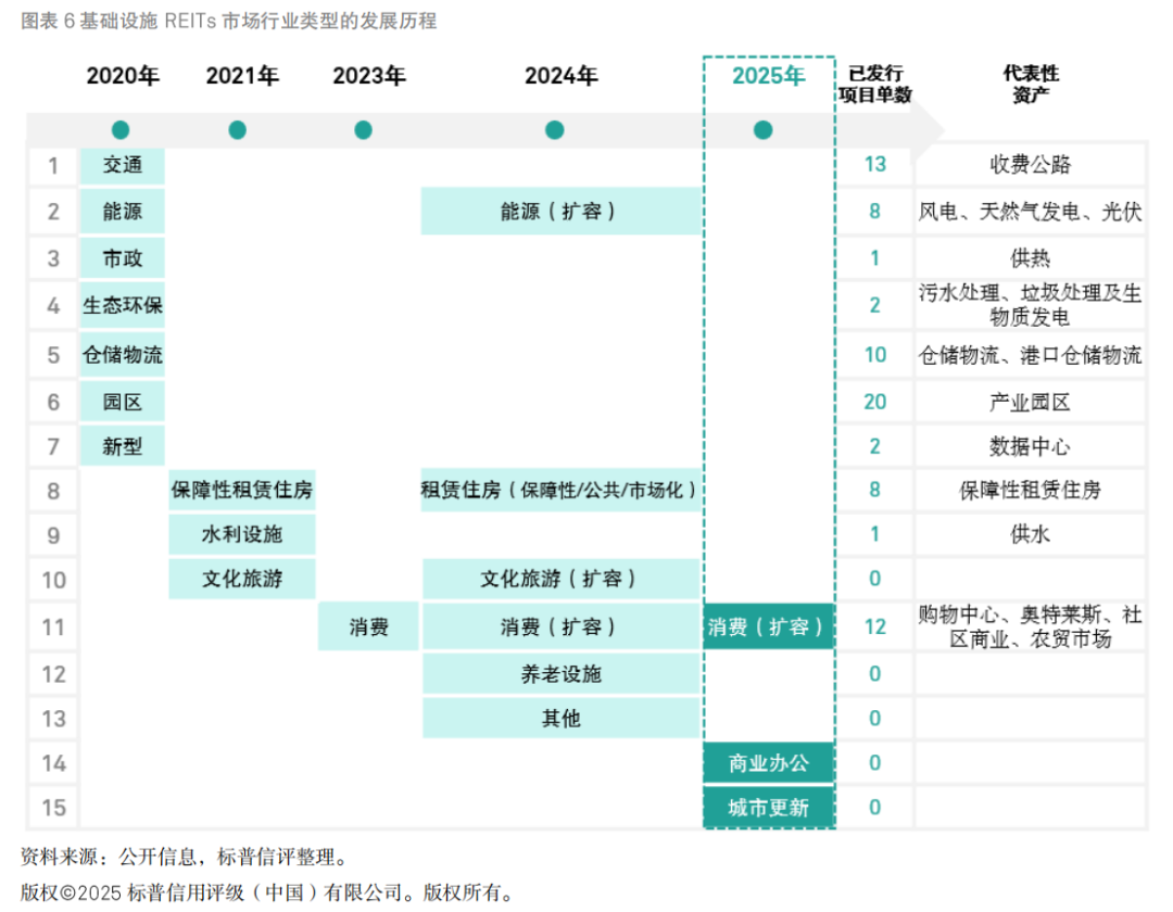 市场规模扩容,资产边界拓展。随着此次新政的推出,我国REITs底层资产向全门类迈出重要一步,市场规模将进一步扩容,并与境外成熟的REITs市场进一步接轨。从我国REITs市场行业类型的发展历程来看, 基础设施REITs经历了多次行业扩围,从首批的7个行业大类拓展至 15 大类;本次“基础设施REITs行业扩围2025版”新增了商业办公和城市更新设施两大类,并对原有的消费基础设施的范围进行了扩容,涵盖了体育场馆项目、商旅文体健、四星级及以上酒店项目等。同时,“商业不动产REITs 试点”推出了“商业不动产 REITs” 这一全新的REITs品类,虽然并未明确行业类型,但通过起草背景中的描述,主要是指“商业综合体、商业零售、写字楼、酒店等商业不动产”。此外,商业不动产 REITs的具体申报流程、项目审核要求,以及两类产品在行业范围上的重叠部分的划分等,尚有待后续的相关规则进一步明确。