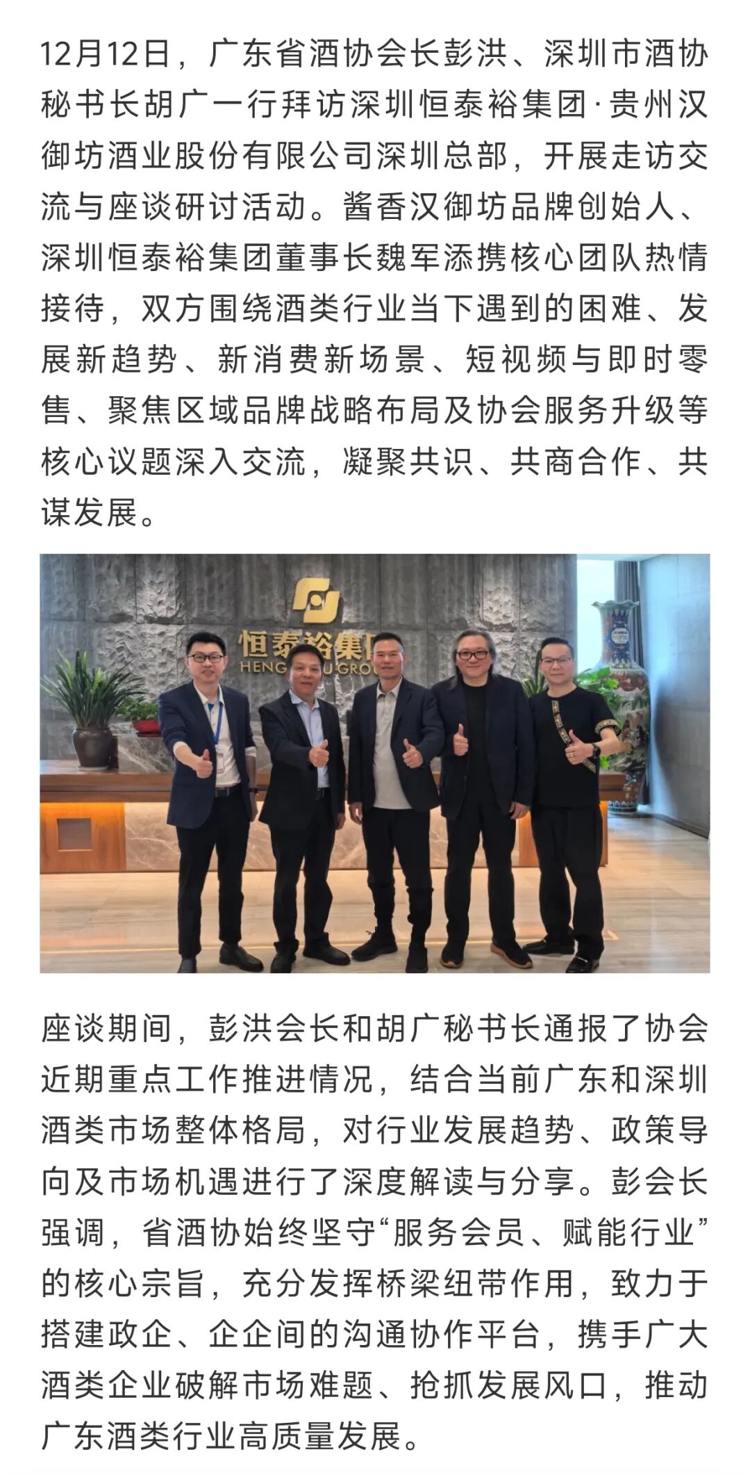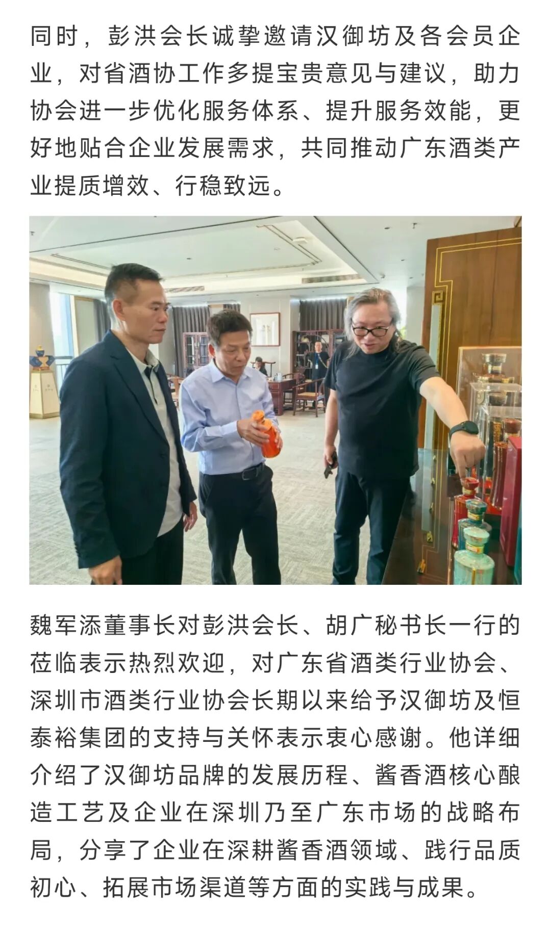 广东省酒协彭洪会长拜访汉御坊深圳总部共话酱香酒行业新发展新路径