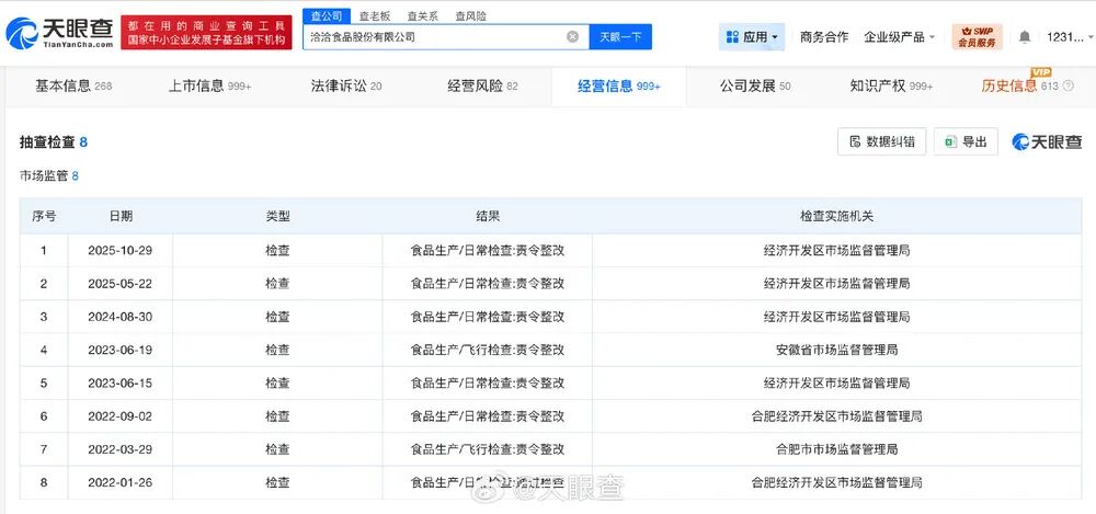 值得一提的是,该公司2022年3月至2025年10月的抽查检查显示,“食品生产/日常检查”“食品生产/飞行检查”结果均为责令整改。