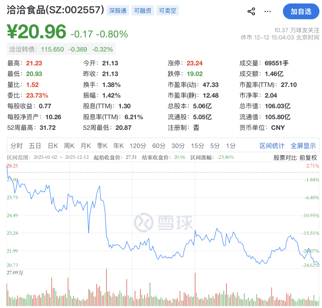 截至12月12日收盘,洽洽食品报20.96元/股,总市值106.03亿元,今年以来,该股股价震荡下行,整体已跌去23%。