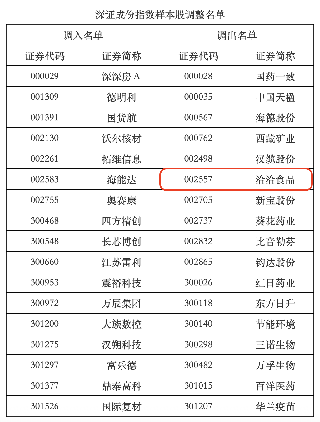 其中,“瓜子大王”洽洽食品被调出深证成份指数样本股。本次调整将于12月15日正式实施。
