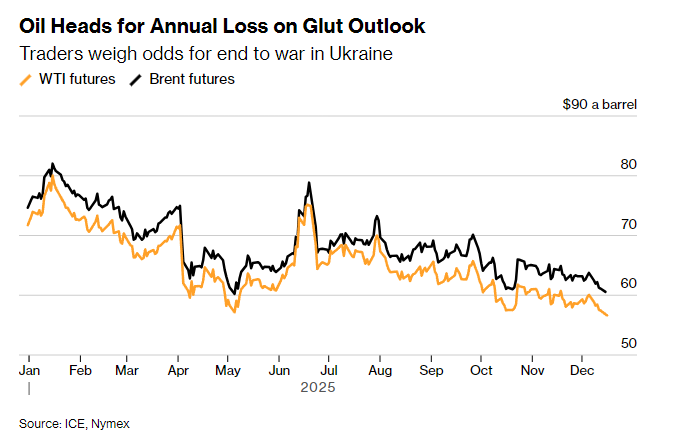 由于市场预期全球供应过剩将持续加剧,油价正迈向年度下跌。目前,欧佩克+正逐步恢复闲置产能,其他产油国也在扩大产量。尽管自2022年初冲突爆发以来,俄罗斯原油出口大体保持稳定,但俄乌冲突若达成停火协议,可能导致美国放宽对俄制裁。