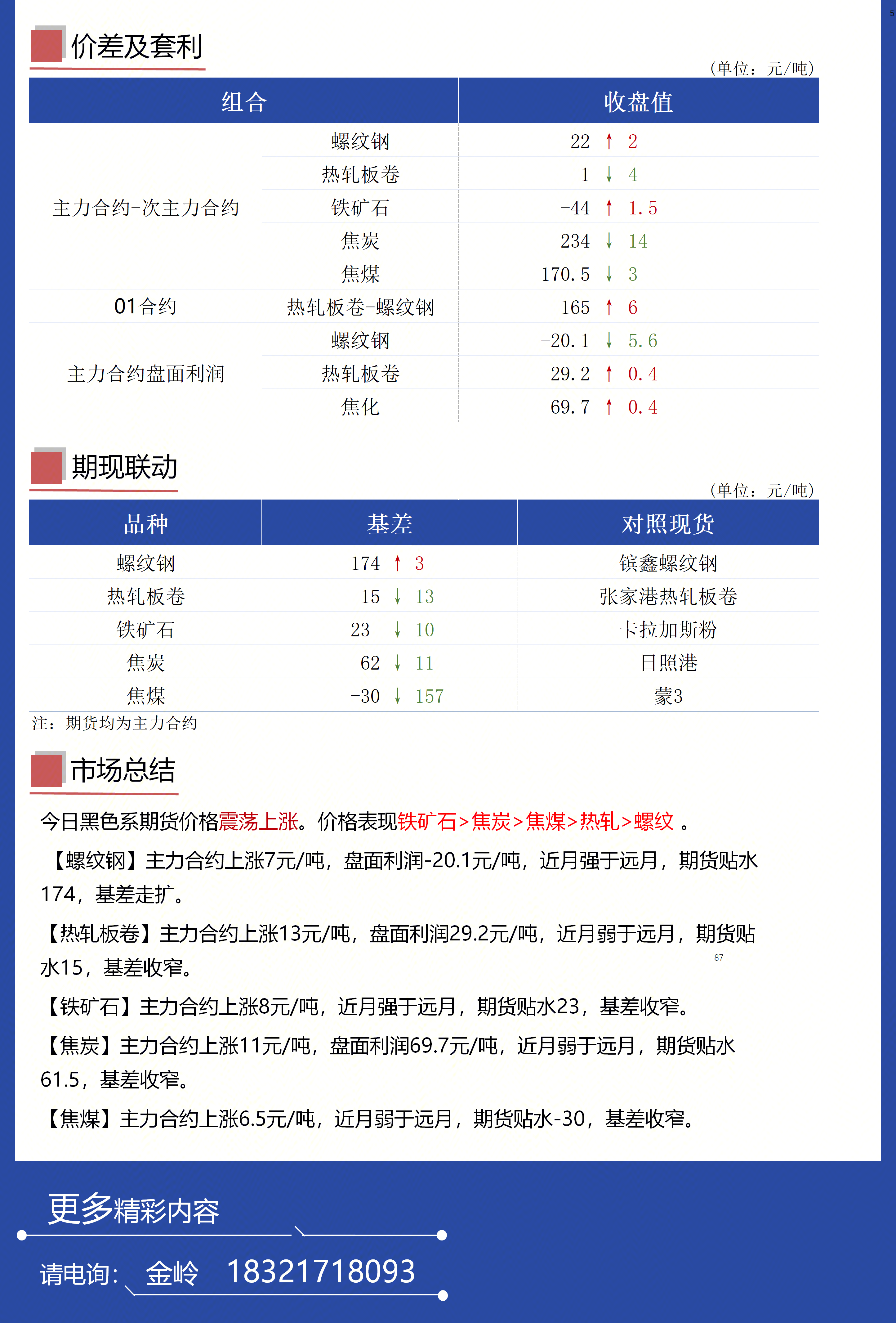 今日黑色系期货价格震荡上涨。价格表现铁矿石>焦炭>焦煤>热轧>螺纹 。 【螺纹钢】主力合约上涨7元/吨,盘面利润-20.1元/吨,近月强于远月,期货贴水174,基差走扩。【热轧板卷】主力合约上涨13元/吨,盘面利润29.2元/吨,近月弱于远月,期货贴水15,基差收窄。【铁矿石】主力合约上涨8元/吨,近月强于远月,期货贴水23,基差收窄。【焦炭】主力合约上涨11元/吨,盘面利润69.7元/吨,近月弱于远月,期货贴水61.5,基差收窄。【焦煤】主力合约上涨6.5元/吨,近月弱于远月,期货贴水-30,基差收窄。