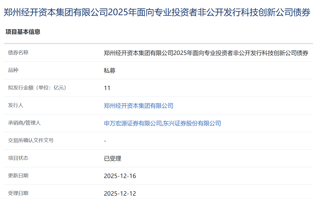 消息】12月16日消息,郑州经开资本集团有限公司2025年面向专业投资者非公开发行科技创新公司债券项目获上交所受理。本期债券拟发行规模11亿元,承销商/管理人为申万宏源证券、东兴证券。