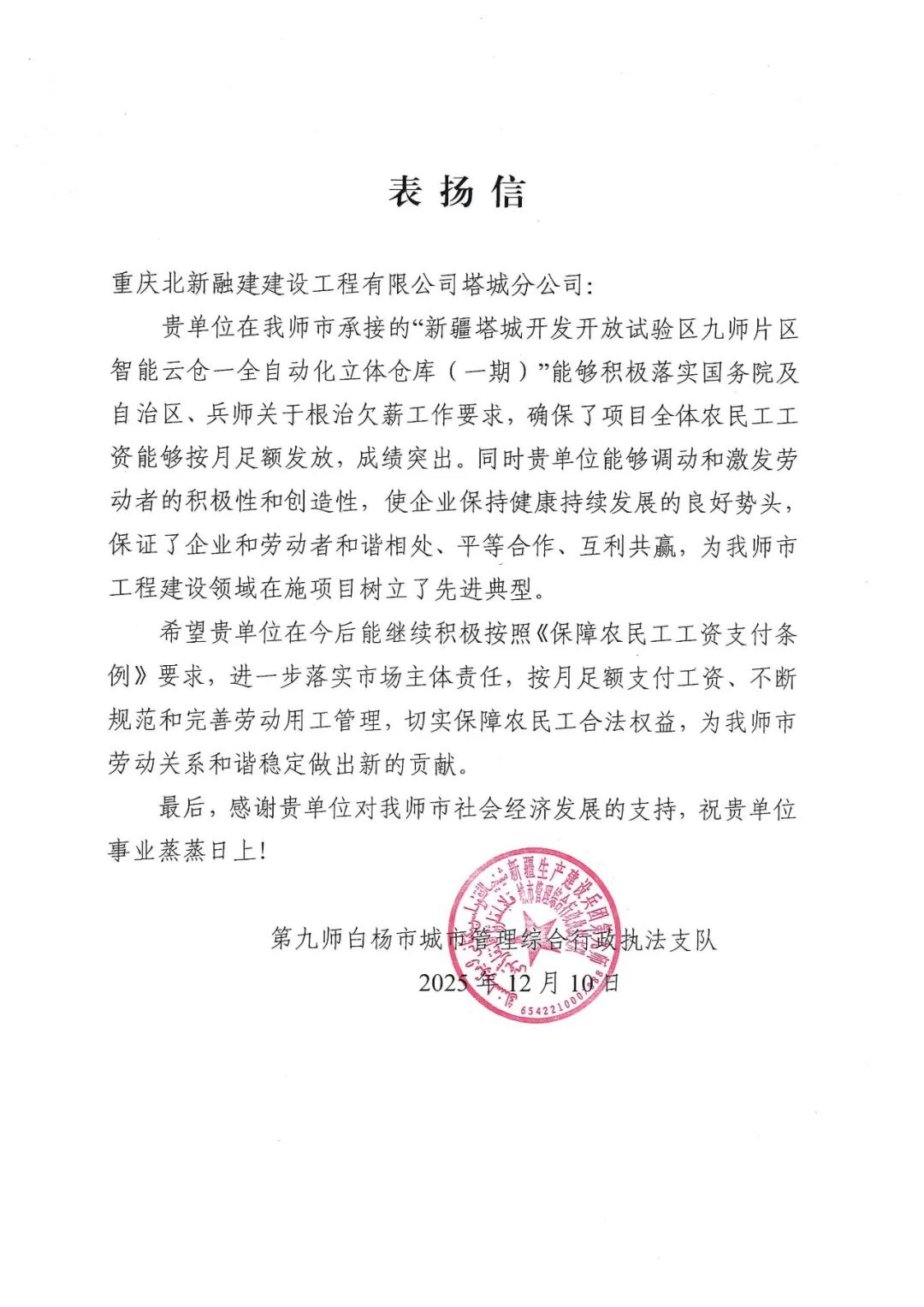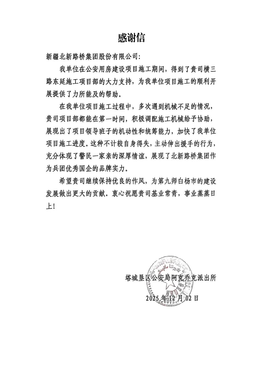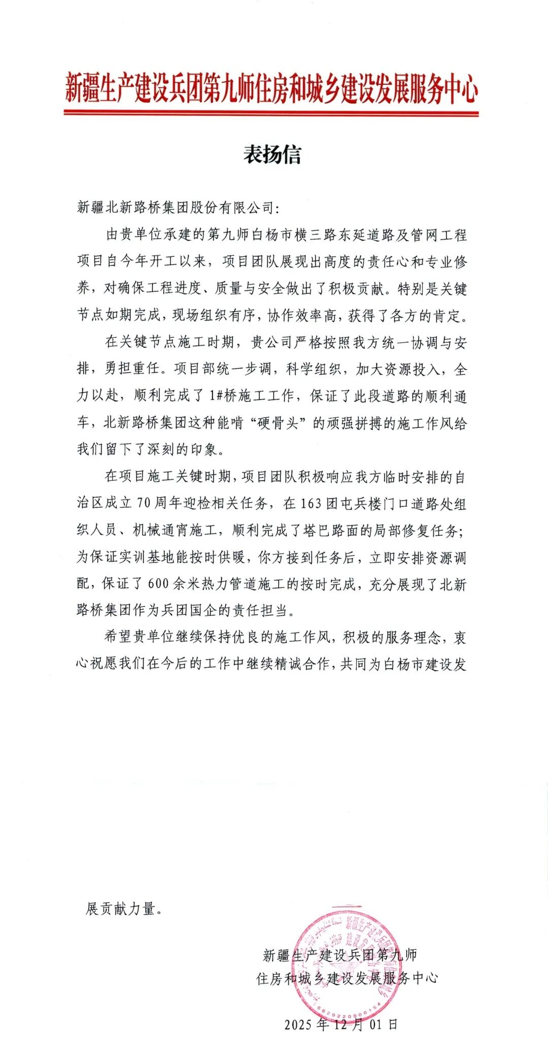 一封封表扬信,既是荣誉更是鞭策。北新路桥集团将持续以高标准、严要求推进项目建设,用实干实绩回馈各方信任,为北疆边境地区高质量发展与民生改善注入更强劲的“北新力量”。