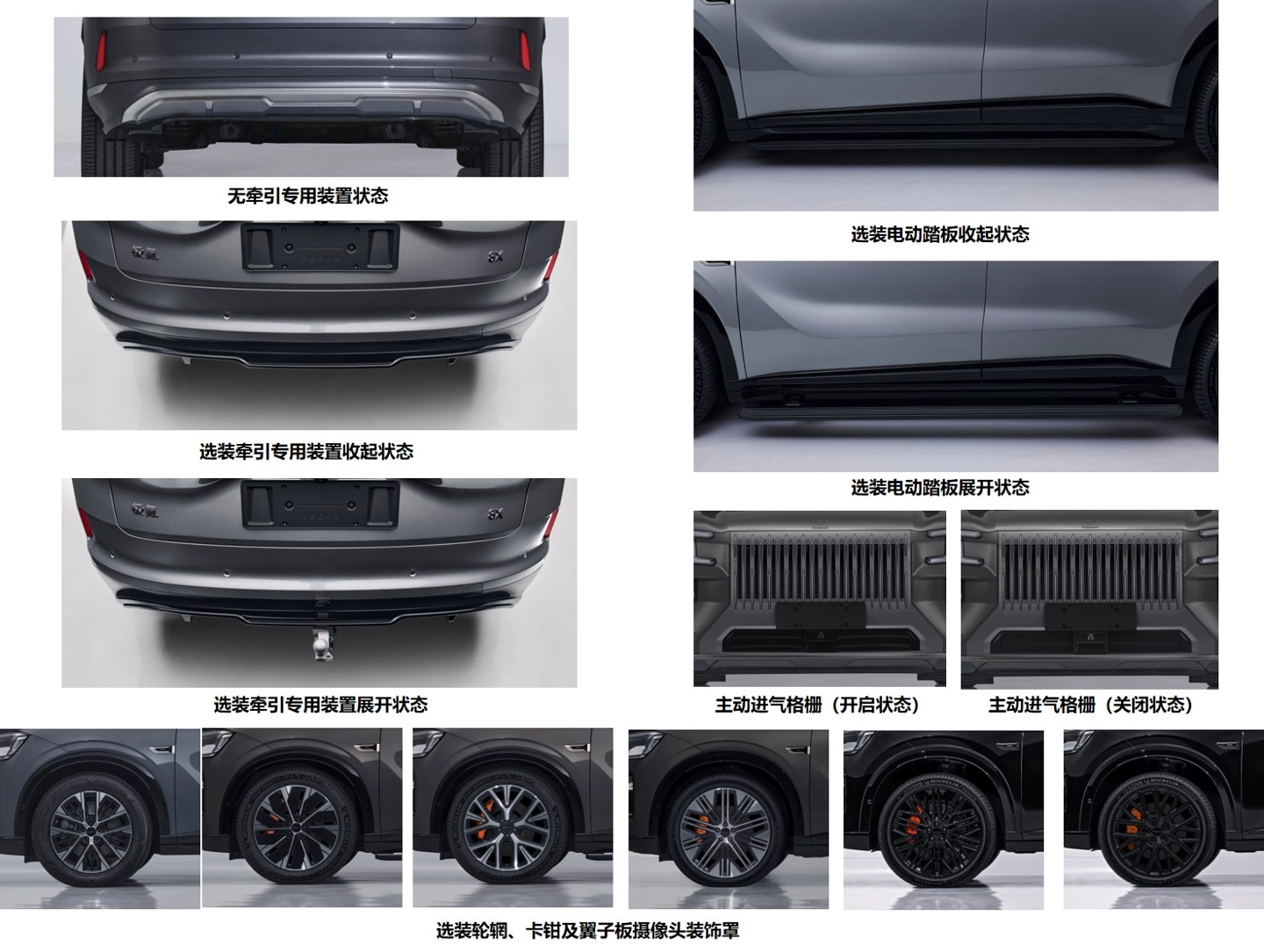 从工信部公布的参数信息获悉,这款新车长宽高分别为 5100/1998/1780mm,轴距 3069mm,总质量达到 3250/3300/3370kg,整备质量区间则是 2690-2820kg,属于中大型 SUV 的范畴。信息显示,新车可选深色 Logo 字标、镀铬或熏黑饰条,还提供了流媒体后视镜摄像头及不同样式的前格栅。同时,新车提供了电动踏板、牵引装置以及主动进气格栅等配置,并带来多款不同样式的轮毂。