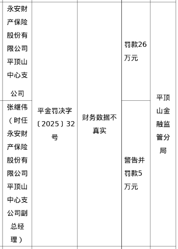 永安财险平顶山中支被罚26万,涉财务数据不真实
