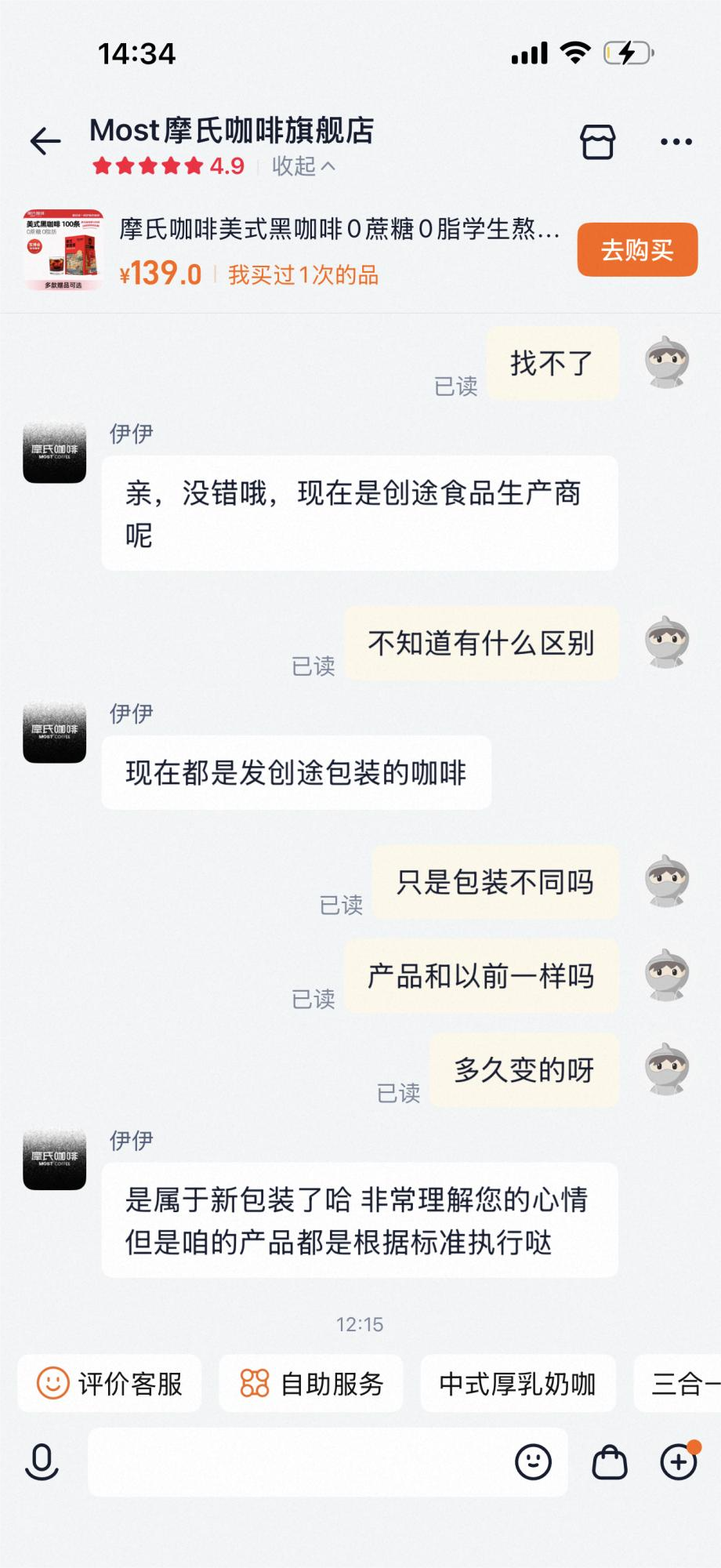 蓝鲸记者以消费者身份咨询淘宝旗舰店客服。客服回应称,该产品现已更换食品生产商,并启用全新包装。客服提供的产品图片显示,新包装已移除了此前引发争议的“坚持0添加,配料表只有咖啡粉”字样。