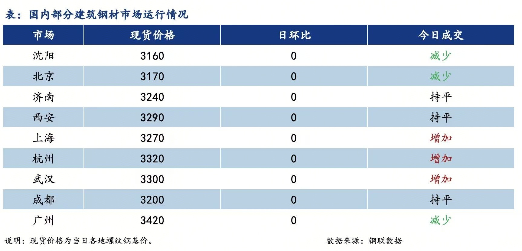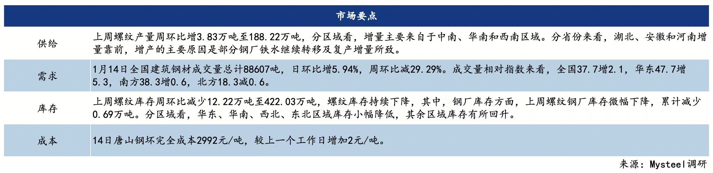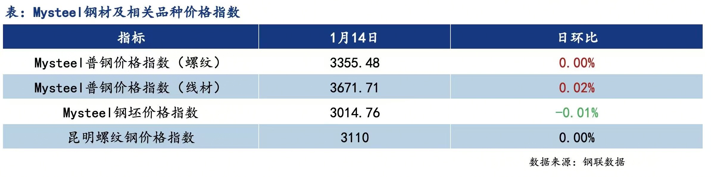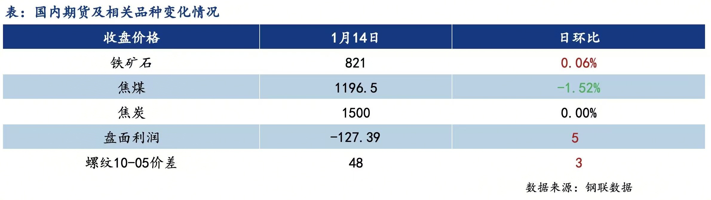 1月14日国内城市建筑钢材价格整体持稳运行,市场观望情绪浓厚。具体来看,早盘期货窄幅震荡运行,国内多数城市建筑钢材现货价格暂稳,市场成交氛围一般。午后期货延续震荡走势,终端以刚需采购为主,实际成交存在部分暗降出售的情况。年前终端需求走弱,部分市场开始进入被动冬储状态,东北地区累库最为明显,但宏观整体偏暖,市场商户多维持谨慎观望,预计短期建筑钢材现货价格弱稳运行,需要关注明日数据情况。全国建筑钢材成交量总计88607吨,日环比增5.94%。