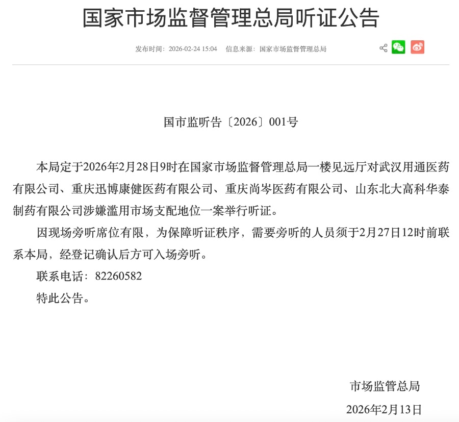 根据公告,国家市场监管总局将于2月28日9时对武汉用通医药有限公司(简称武汉用通)、重庆迅博康健医药有限公司(简称重庆迅博康健)、重庆尚岑医药有限公司(简称重庆尚岑医药)、山东北大高科华泰制药有限公司(简称山东华泰制药)涉嫌滥用市场支配地位一案举行听证。