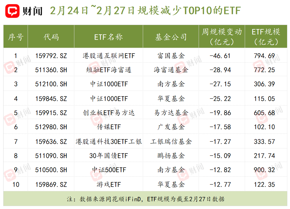 而上周,富国基金旗下的港股通互联网ETF规模下降最多,下降金额为46.61亿元;此外,在春节前备受资金追捧的短融ETF海富通,当周规模也下降了28.94亿元。